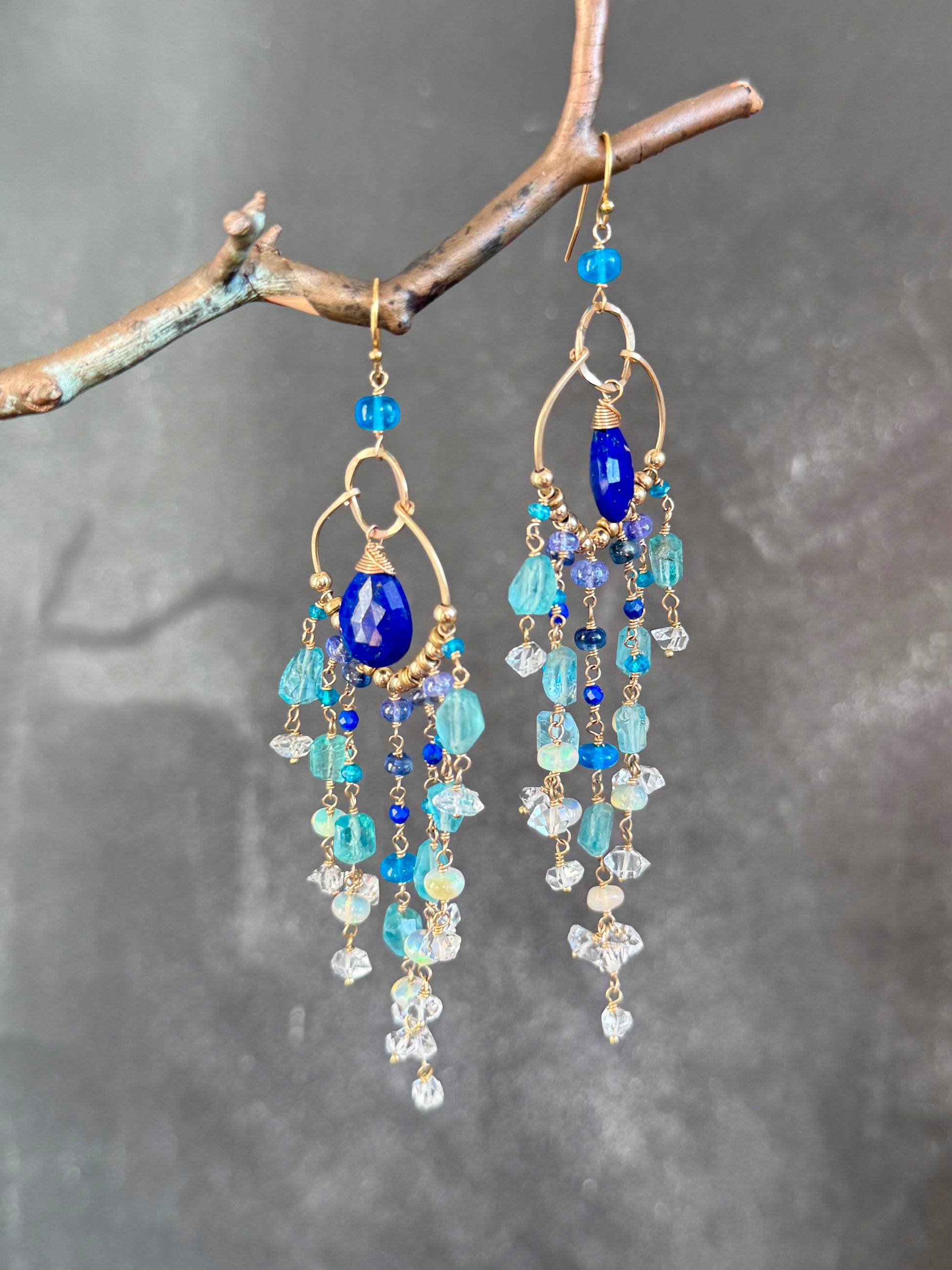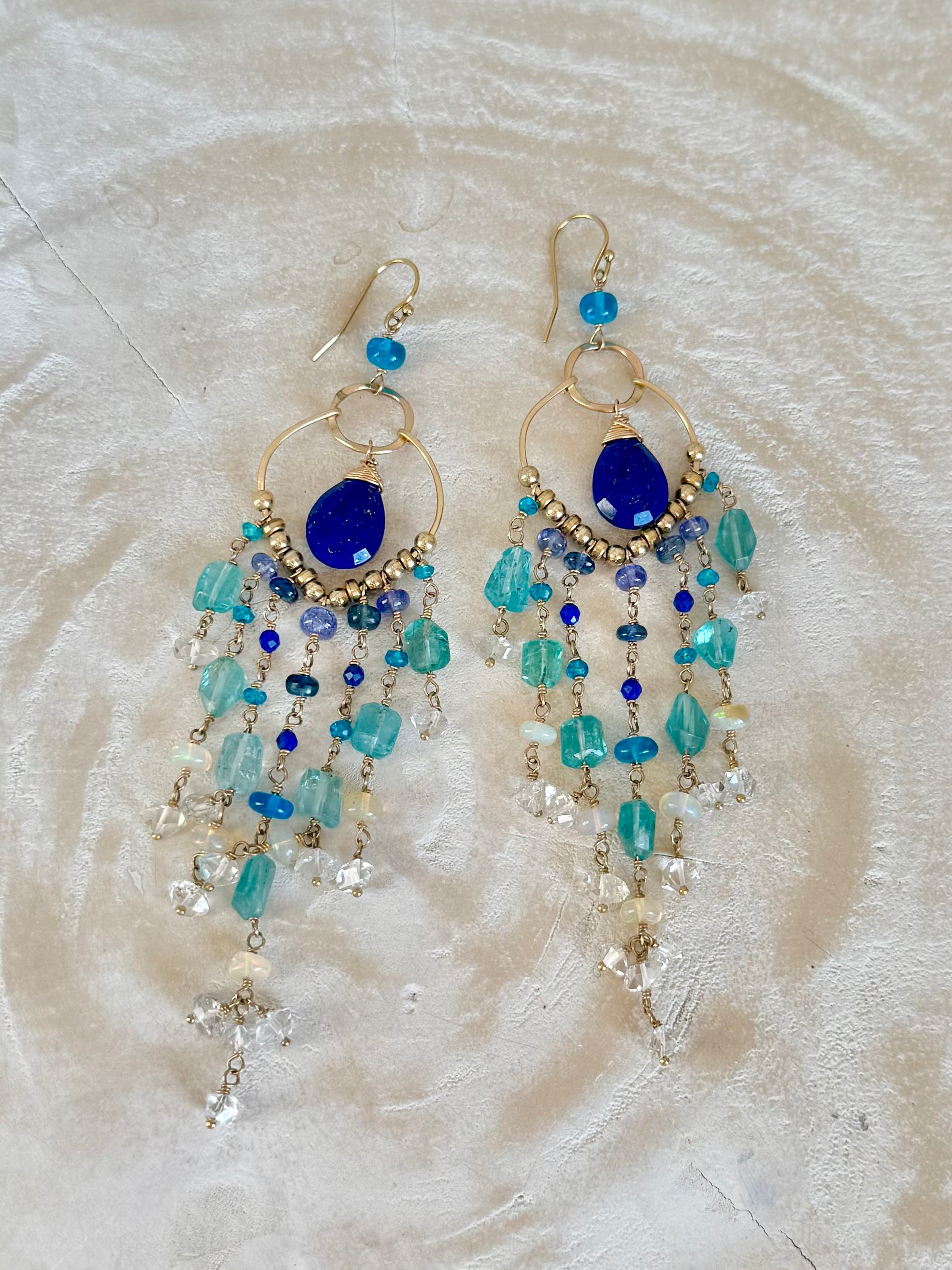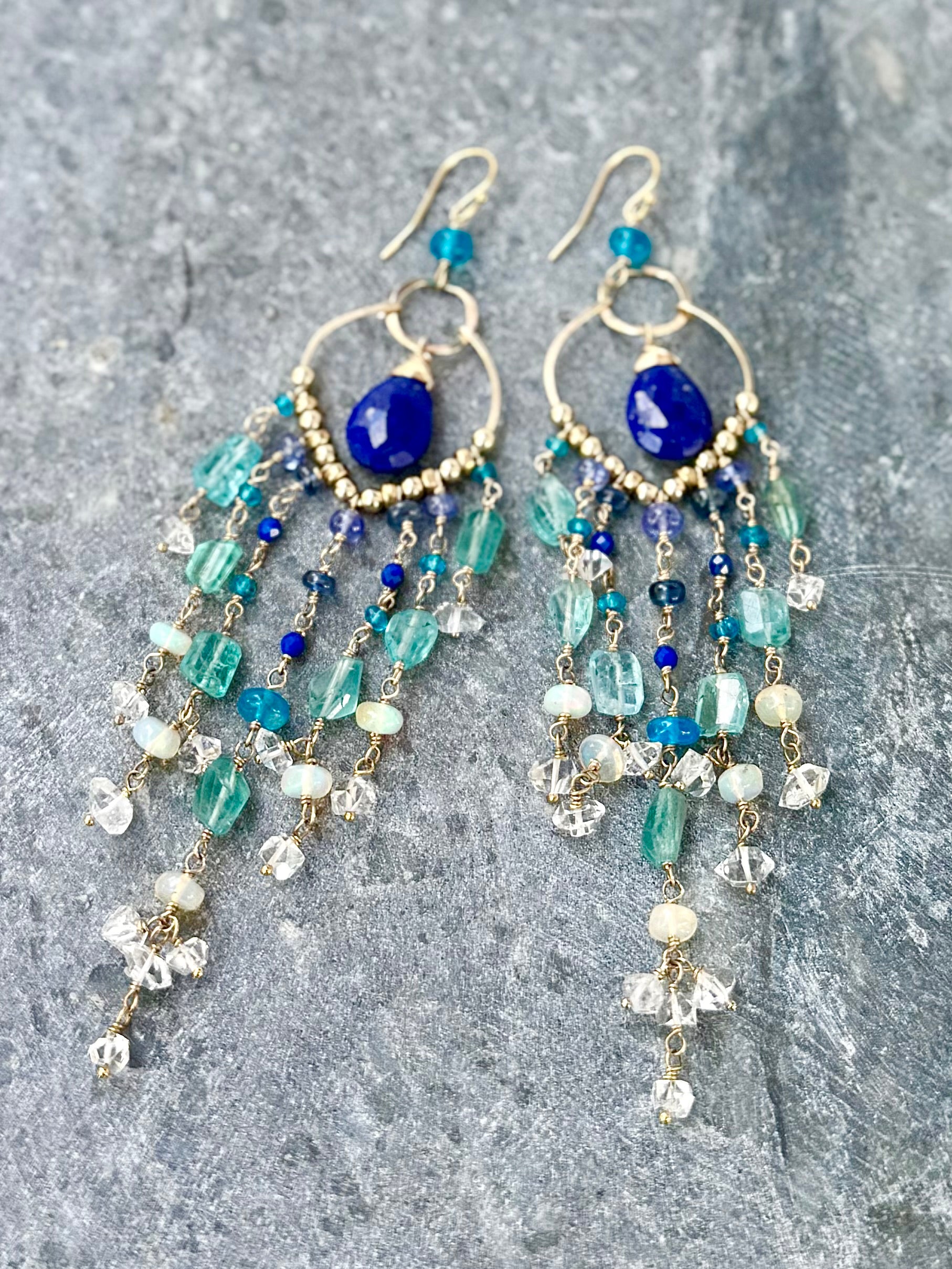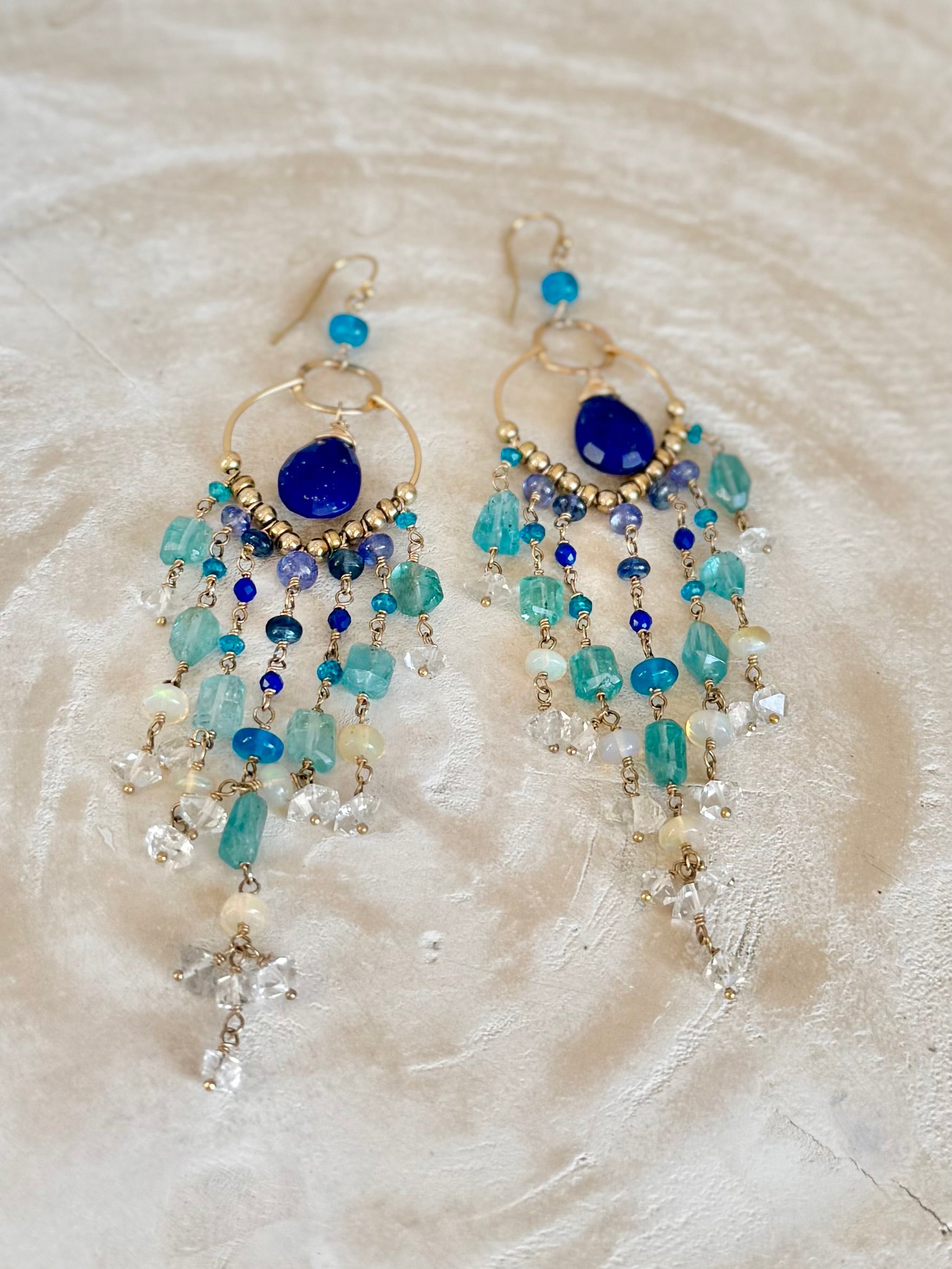 These swingy chandelier earrings feature a menagerie of hues inspired by coastal waters and tales of the deep. Apatite, lapis, kyanite, opal, tanzanite, and herkimer diamonds create this stunning look. All hardware 14k goldfill. 3.5” long