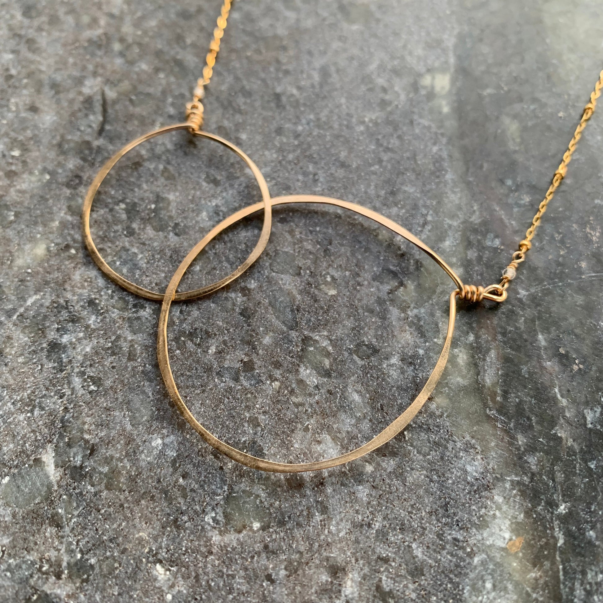 14 karat gold filled metal is hammered and hand formed into circles to create this delicate yet statement necklace. The 14 karat gold filled chain is dotted with tiny beads as accents. Lovely and delicate, this 17” long necklace is finished with a magnet clasp. Can be shortened or lengthened upon request.