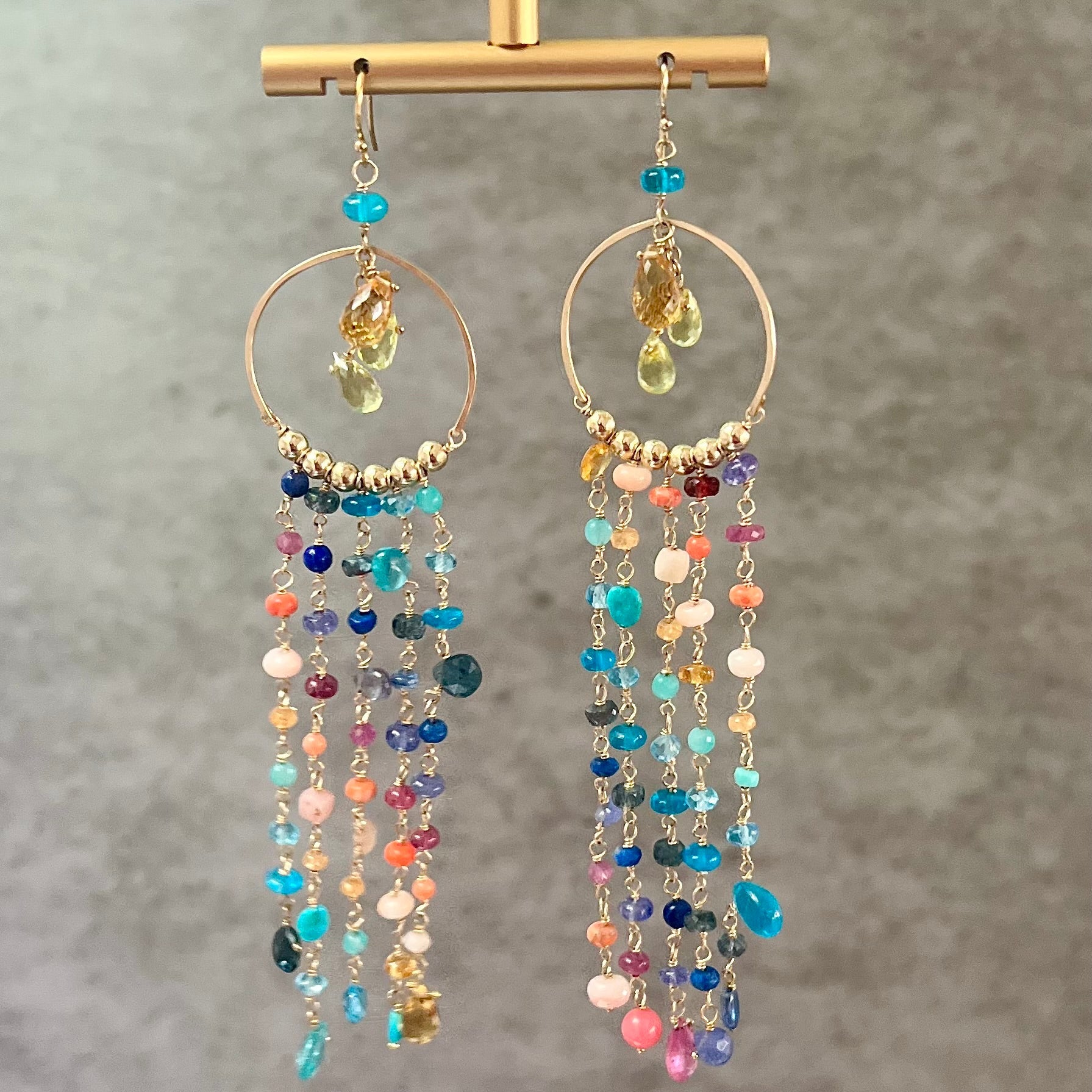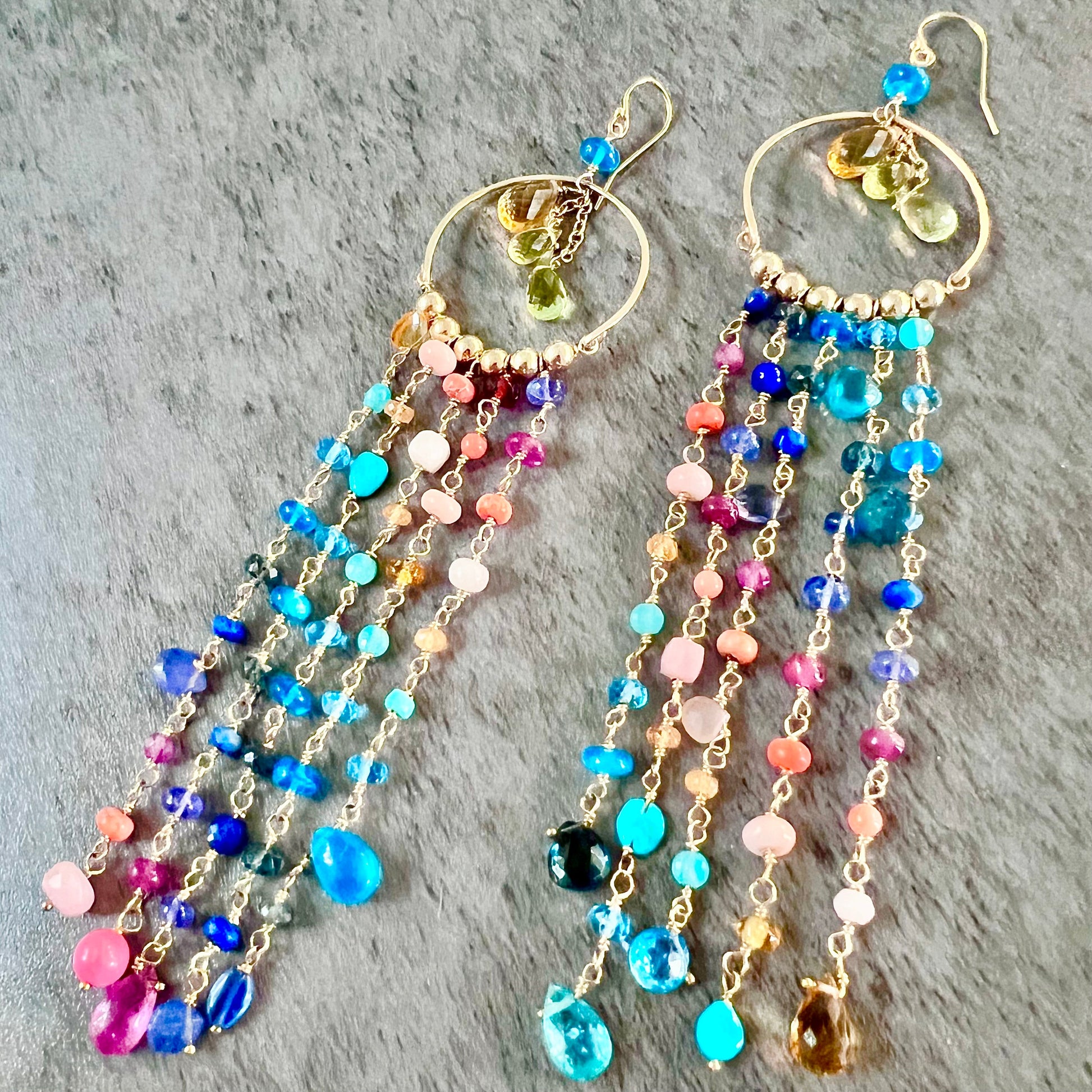 These swingy chandelier earrings feature a menagerie of hues inspired by beautiful Key West sunsets. Apatite, mandarin garnet, turquoise, kyanite, pink sapphire, tanzanite, and coral create this stunning look. All hardware 14k goldfill. 3.5” long
