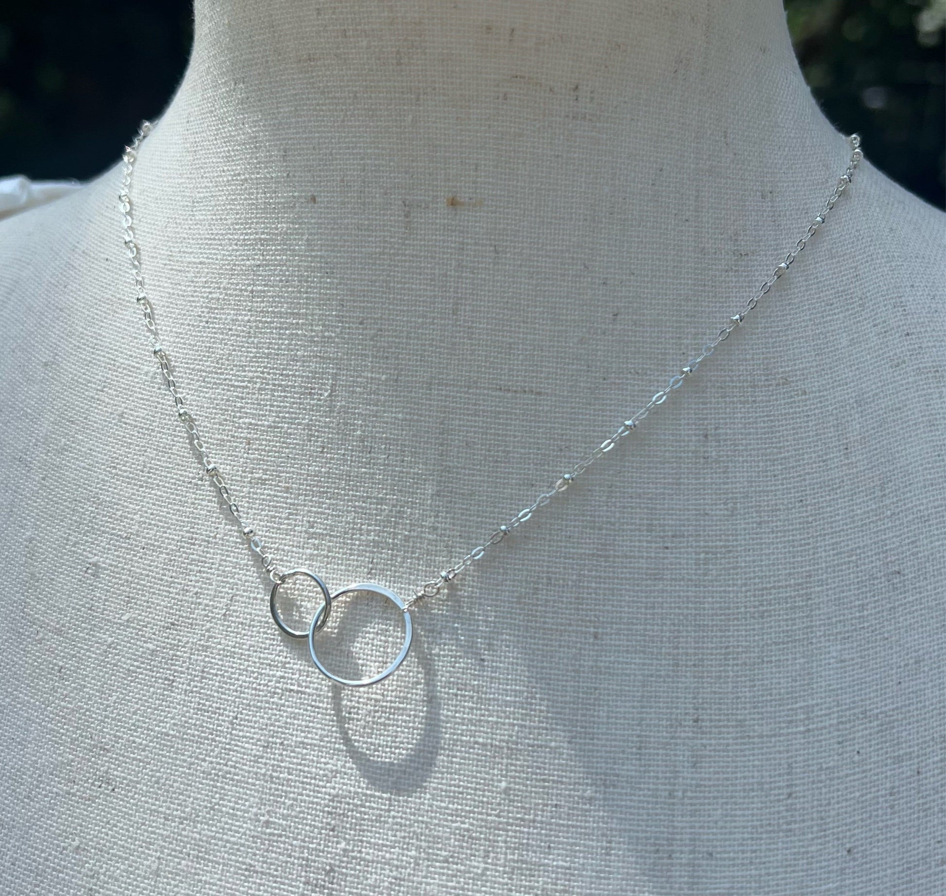 Sterling silver is hammered and formed into interlocking circles to create this delicate yet statement necklace. The sterling chain is dotted with tiny beads as accents. Lovely and delicate, this 16” long necklace is finished with a magnet clasp. Can be shortened or lengthened upon request.